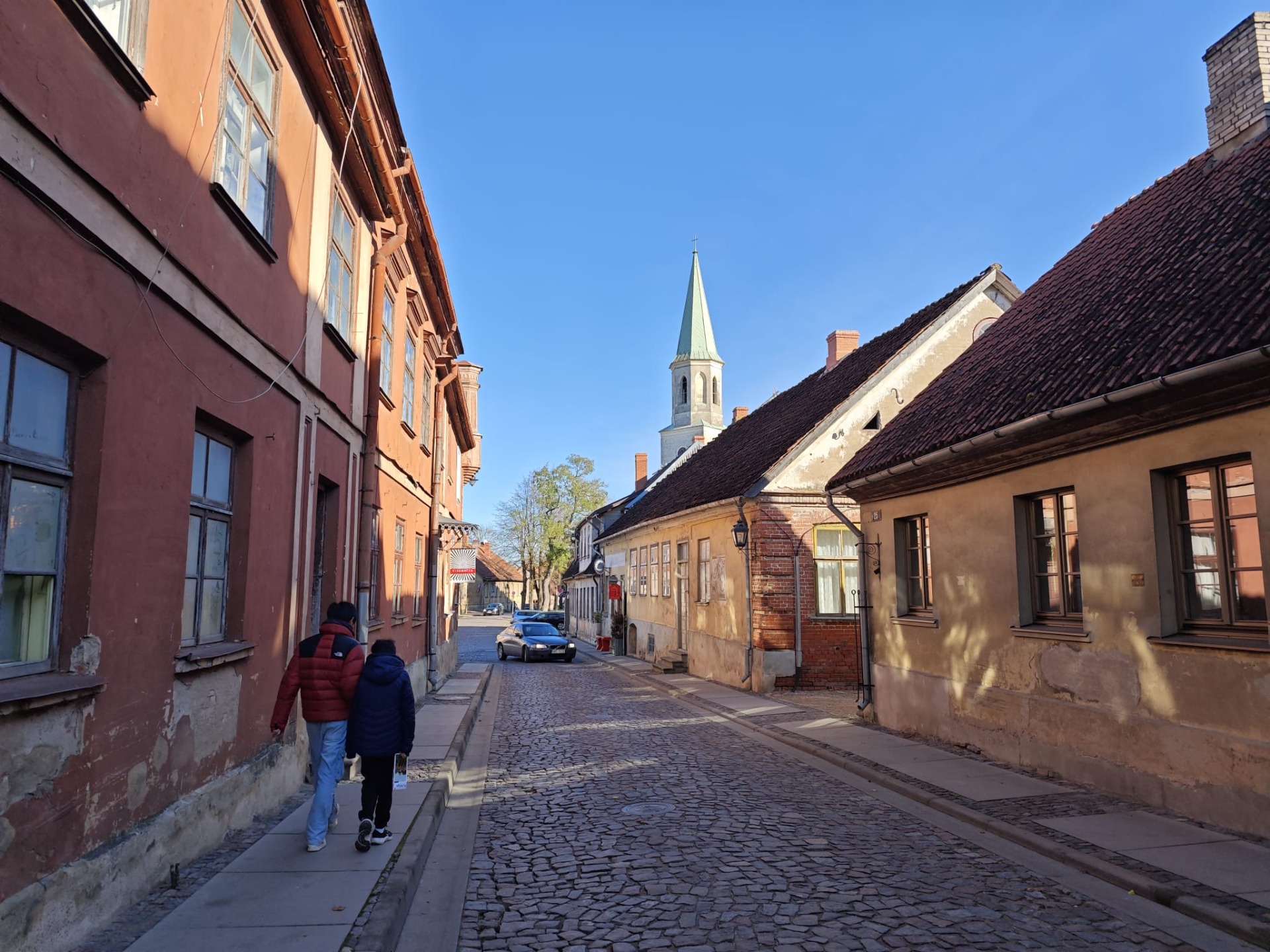 Als volgende besloten we Kuldīga zelf te bezoeken, vooral het historisch centrum, dat op de UNESCO Werelderfgoedlijst staat. We parkeerden onze auto, en zagen meteen dat er overal herfstbladeren op de grond lagen; en dan ook heel veel! Het zag er prachtig uit, vooral doordat deze bladeren zo goed samengaan met de vele beekjes en riviertjes die door Kuldīga stromen, waar het stadje ook om bekend staat.